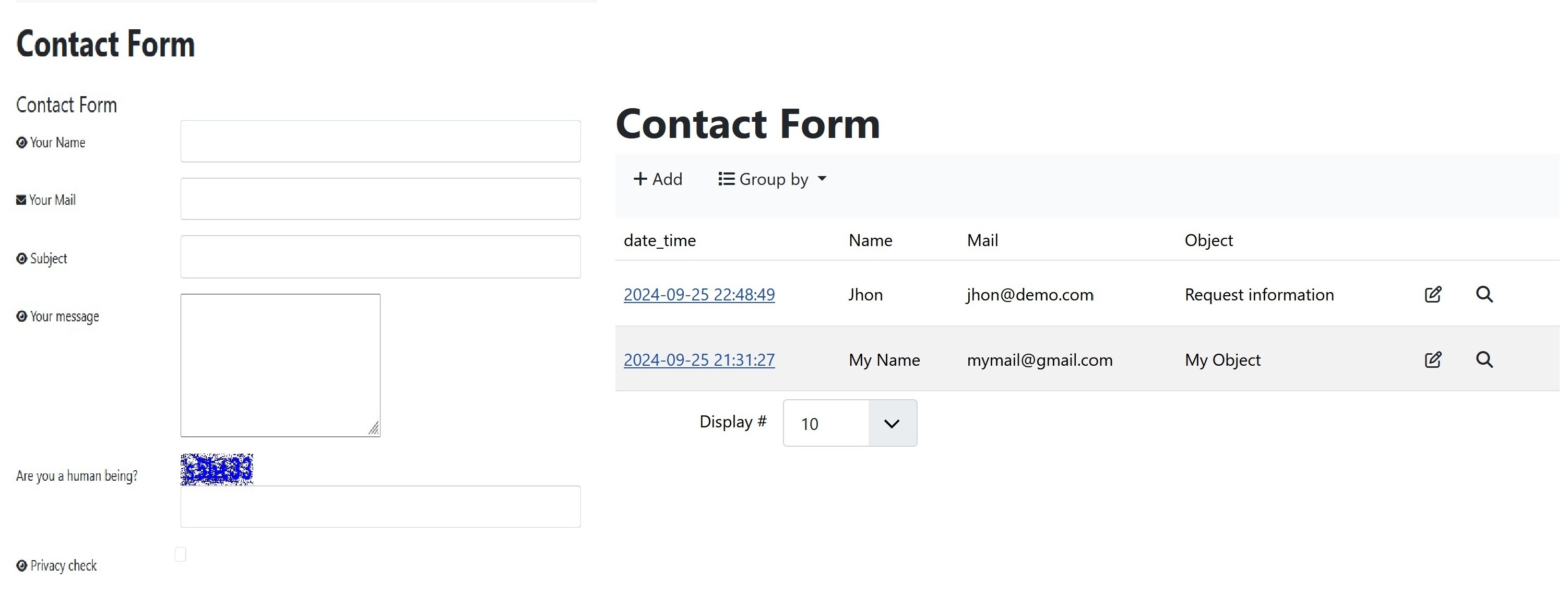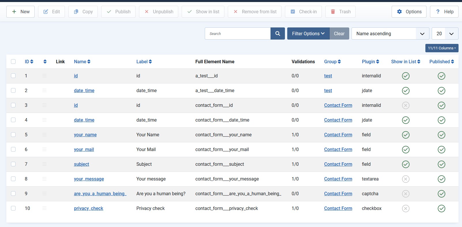 - In our case, we will hide the ID element, which we do not need, and show the elements Your Name, Your Email, and Subject. If desired, we can also show the Message directly in the list.